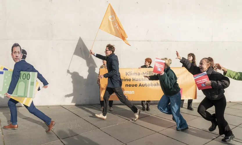 Wir waren live im Berliner Regierungsviertel, wo der Bundestag nur noch bis morgen die Haushaltstricks für neue Autobahnen verhindern kann. Bei unserer Aktion waren sogar Bundeskanzler Merz und Finanzminister Klingbeil dabei. Wenn auch nur als Doubles...